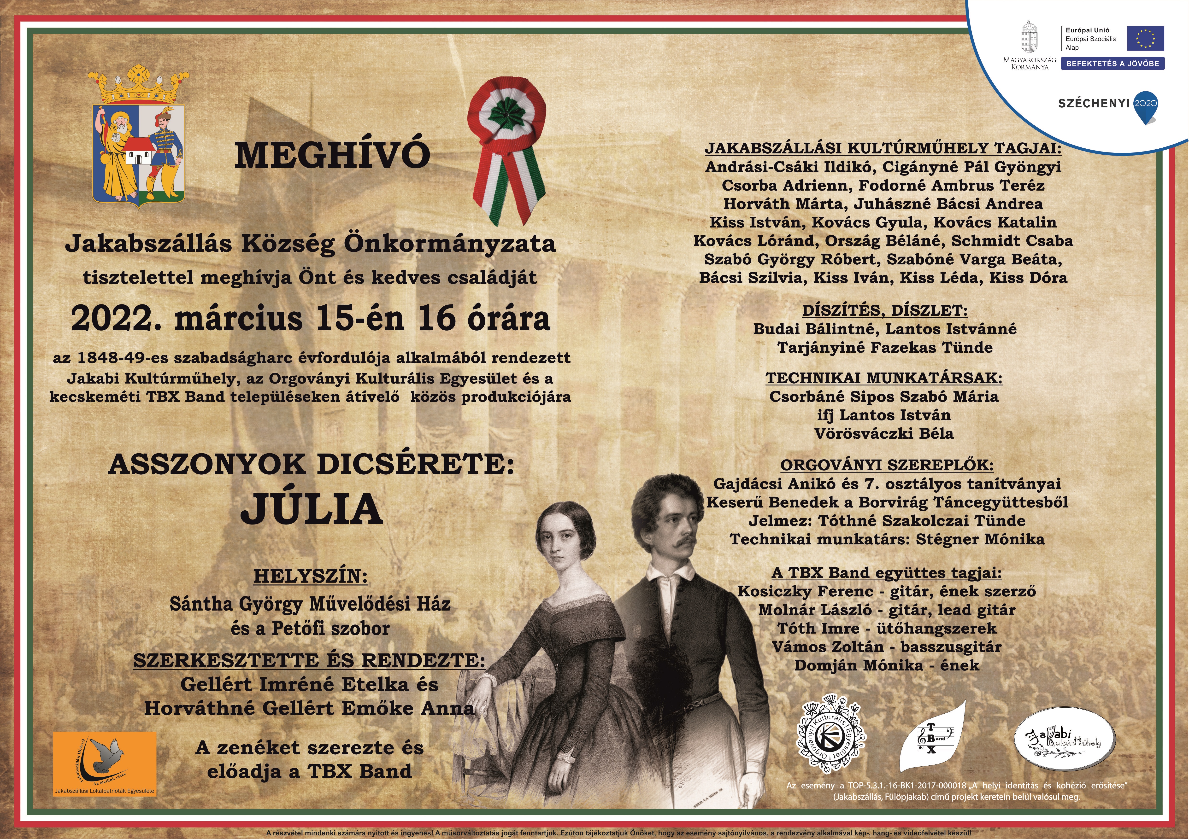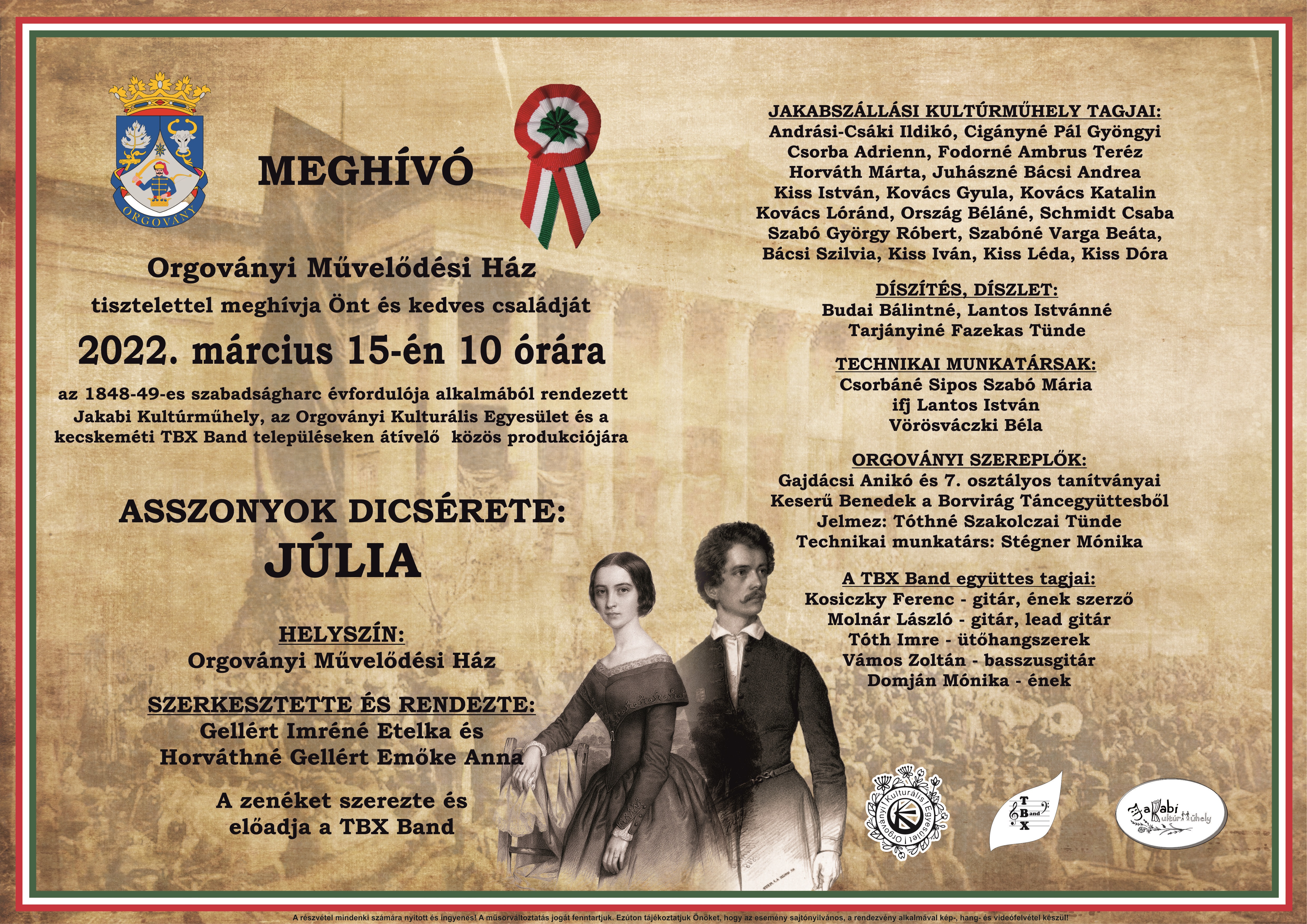 Az Orgoványon 10 órakor, Jakabszálláson pedig 16 órakor kezdődő megemlékezésen az Asszonyok dicsérete: Júlia című előadást tekinthetik majd meg az érdeklődők. Az 1848-49-es szabadságharc évfordulója alkalmából rendezett darab a Jakabi Kultúrműhely, az Orgoványi Kulturális Egyesület és a kecskeméti TBX band településeken átívelő közös produkciója.